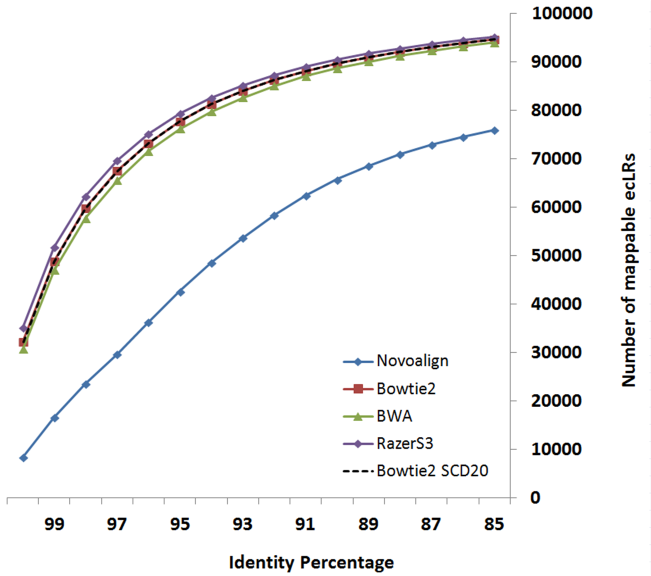 Following figures compare LSC correction results configured with different supported aligners. Identity metric is defined as number-of-matchs/error-corrected-read-length after aligning reads to reference genome using Blat.