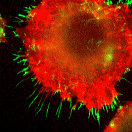 Immunofluorescent stain of moesin and f-actin in the cytoskeleton of a macrophage