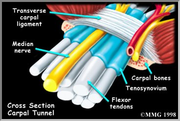 The flexor tendons move in and out of the tunnel, sliding against each other, whenever you bend your fingers. To help lubricate the movement, a slippery substance called the tenosynovium (shown in blue below) coats the tendons.