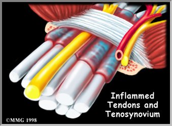 ![]() Such overuse irritates the flexor tendons and the tenosynovium surrounding them. They react to the irritation by becoming inflamed (shown in red in the illustration). This inflammation causes pressure on the median nerve, which consequently brings about the symptoms of CTS. Inflammation of the tenosynovium is called tenosynovitus. |