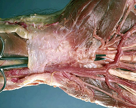 This image shows most of the relevant soft structures of the hand important in CTS. The surgical scissors have been inserted through the carpal tunnel.