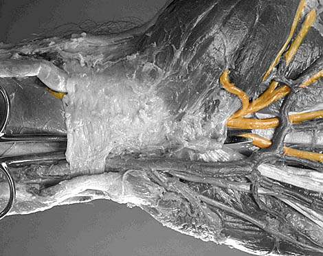 Highlighted in yellow is the median nerve. You can see how it travels through the carpal tunnel to the hand.