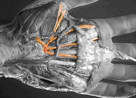 Another view of the median nerve, highlighted in yellow. It emerges from under the transverse carpal ligament and can clearly be seen to innervate the thumb, index, middle and ring fingers. Also clear is the branch innervating the thenar muscle group.