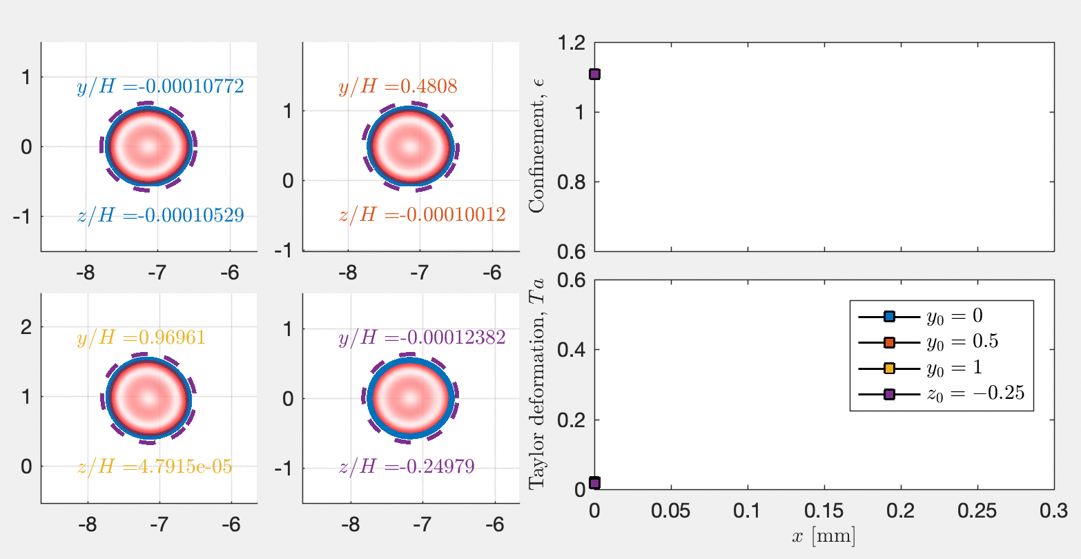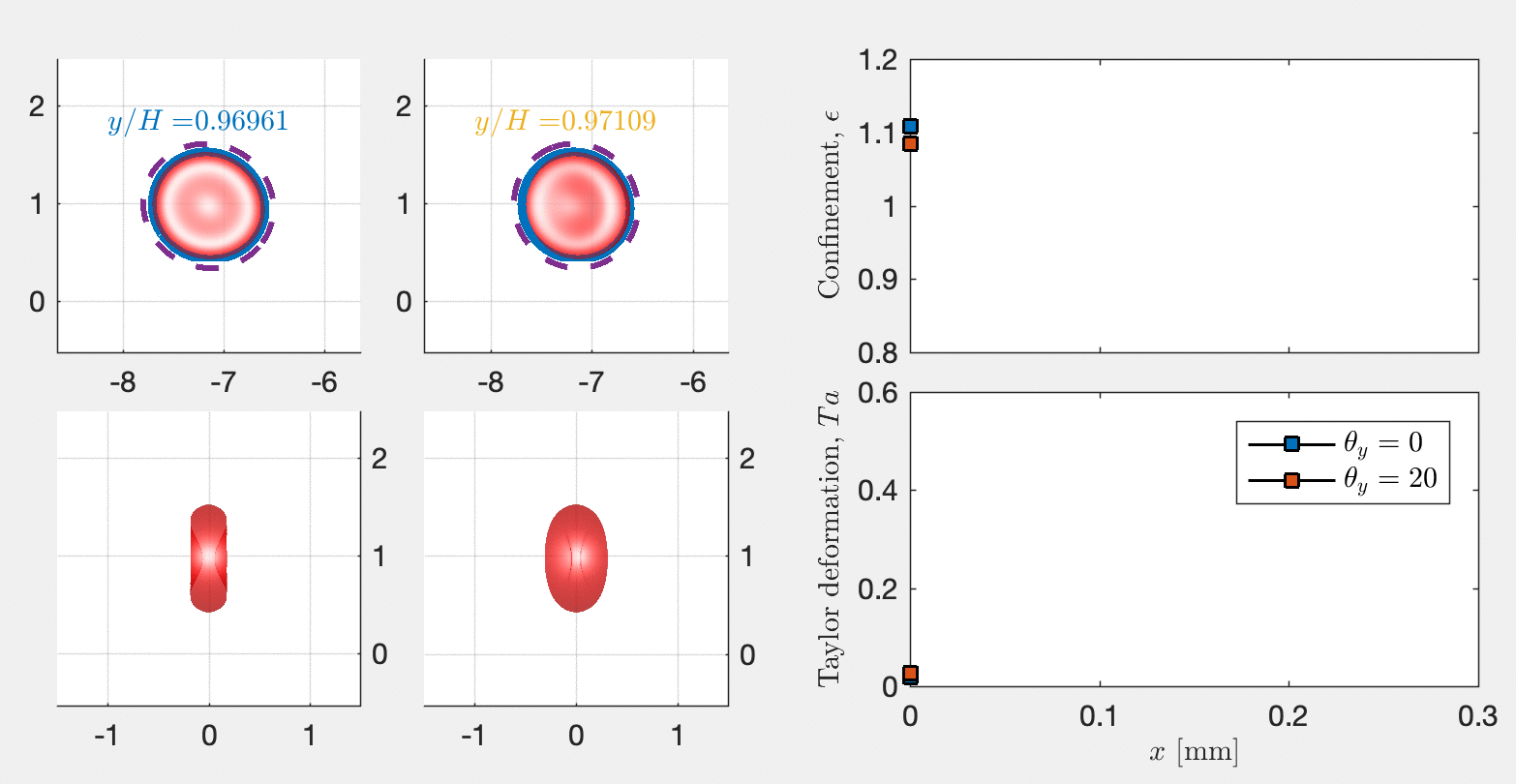 Link to videos: The simulations were conducted to evaluate the impact of initial condition, and to find the steady-state shape, respectively. We utilized the steady-state shapes to generate a surface for data interpretation relating the three important non-dimensional parameters: the Taylor deformation, the confinement, and the capillary number (based on cell velocity).