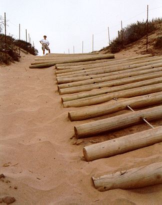 Trudging northward along the surf, I spy the "cheerleaders" stationed on the beach, clapping and shouting to all the runners. "Hey, y'know, this isn't the place you need to be; you KNOW where the suffering is. Get up there!" They laugh and one replies, "It's even tougher up there this year; they took out the railroad ties at the top." "What?? Oh, I know what you mean, I heard that they fixed that steep step where the ties begin." "No, there's a whole section of ties gone." Huh?? They begin loping north, leaving me marvelling at their easy gait. Man oh man, they even run like that in SAND f'gawdsakes! But what's this about the railroad ties? This does not sound encouraging.