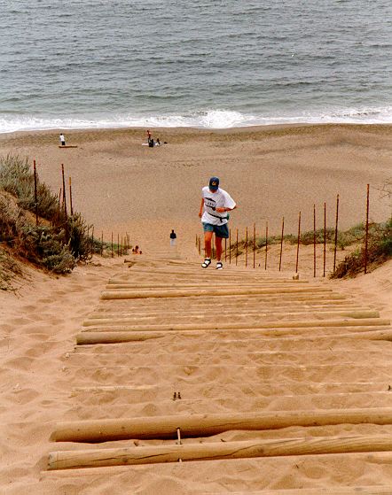 Through the cul de sac and back to the sand. Ooooh, yum, gotta love that sinking feeling! As I descend the last of the railroad tie steps into the dunes a guy runs by and calls out to me, "Go, Sandgirl!" Hey, he was with me when I hit Baker Beach on the way out and proclaimed my undying devotion to sand running. What's he doing behind me? Well, whatever! "Go, Dude! Get ready for that Sand Ladder!" Yep, it's approaching fast. Gird your loins for battle, kids; here's where the fun *really* begins.