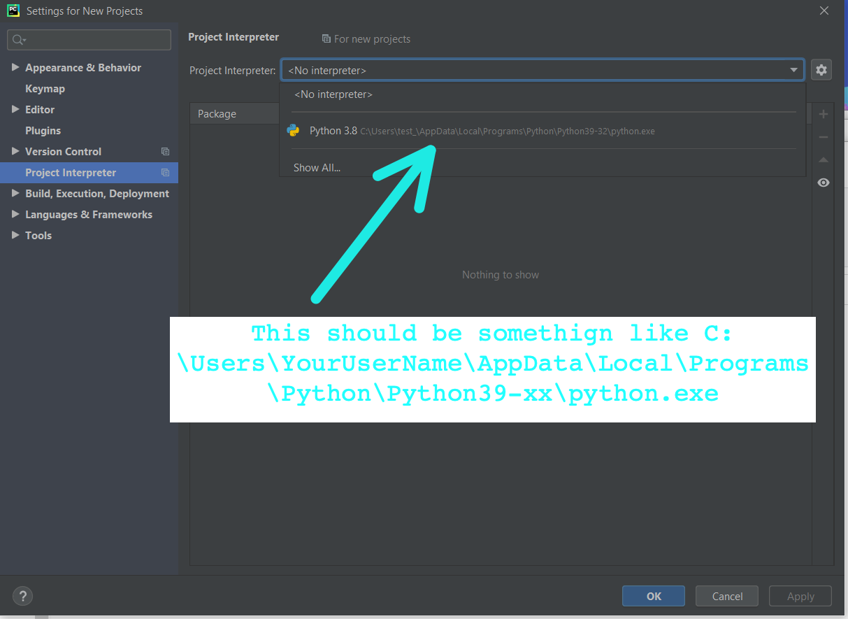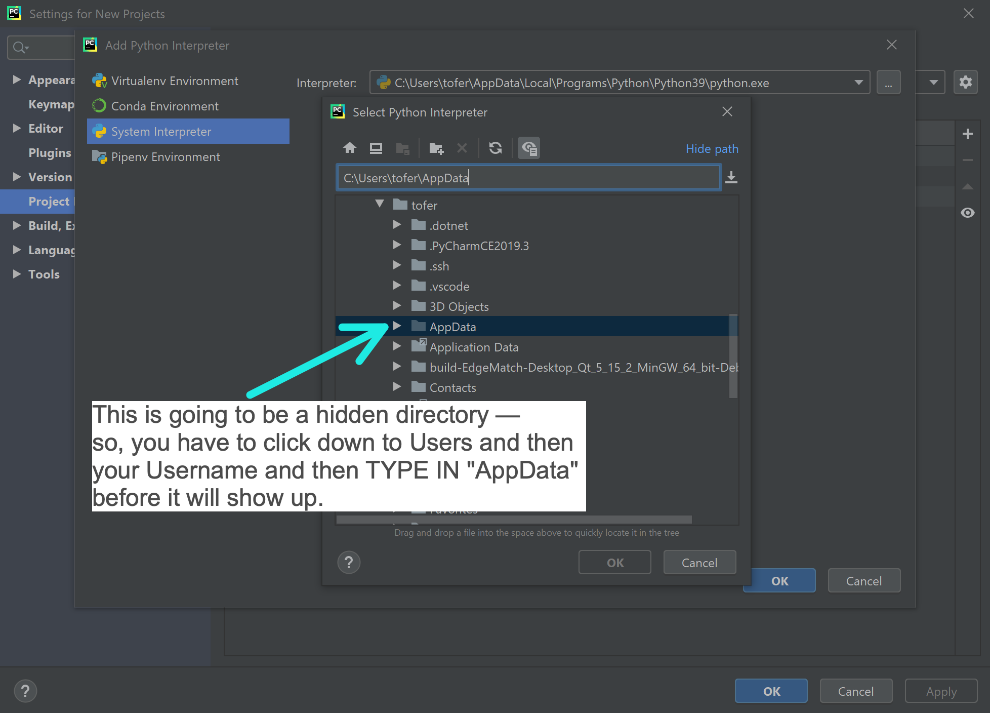 - You will have to find C:\Users\YourUserName\AppData\Local\Programs\Python\Python39\python.exe but the AppData directory will be hidden, so you will probably have to type it in after you get to your username!. See here: