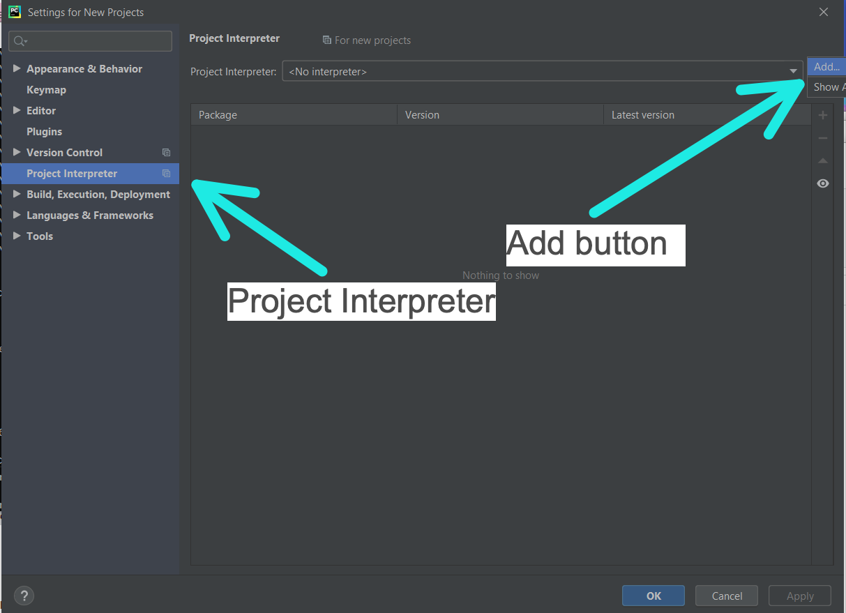 - Select "Project Interpreter" in the left hand side of the window. Click on the gear icon on the right side of the "Project Interpreter" text box, then select "Add".