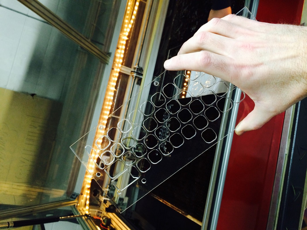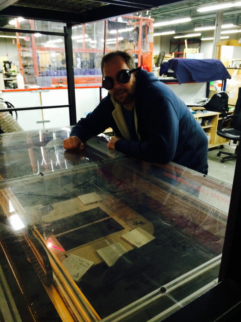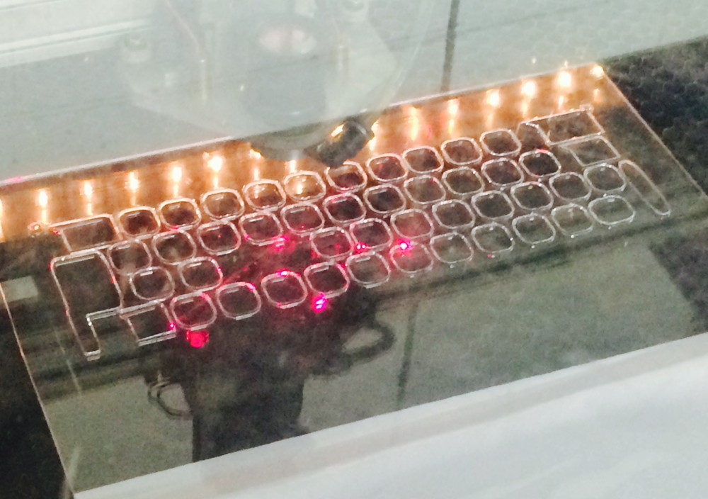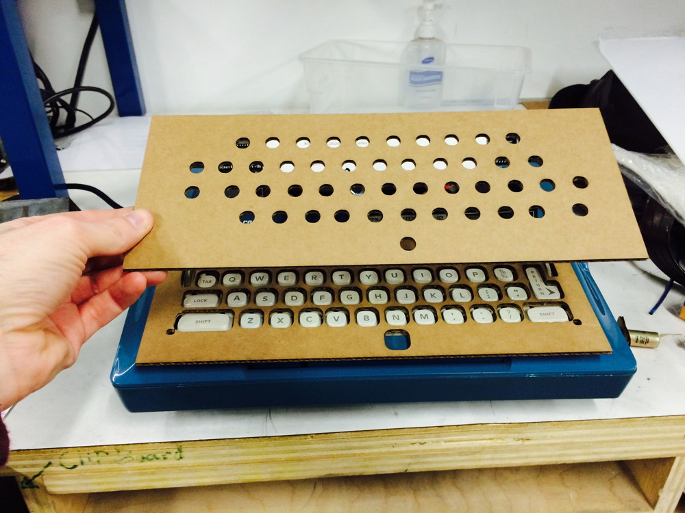 Derek's real genius involved the two-layer setup. The bottom layer fits perfectly over the typewriter keys, creating a solid foundation, and the top layer holds the solenoids, and is bolted to the bottom layer. Together, they create a solid, immovable structure that guarantees that the solenoid vibration won't dislodge any of the solenoids out of place. (and the last picture below is Derek in his fancy laser-proof glasses).
