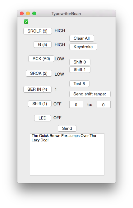 I also wrote an OS X application to provide the human interface to the Arduino, for both debugging and for the original output. The program (see below) still has a lot of the residual debugging features, which came in very, very handy.
