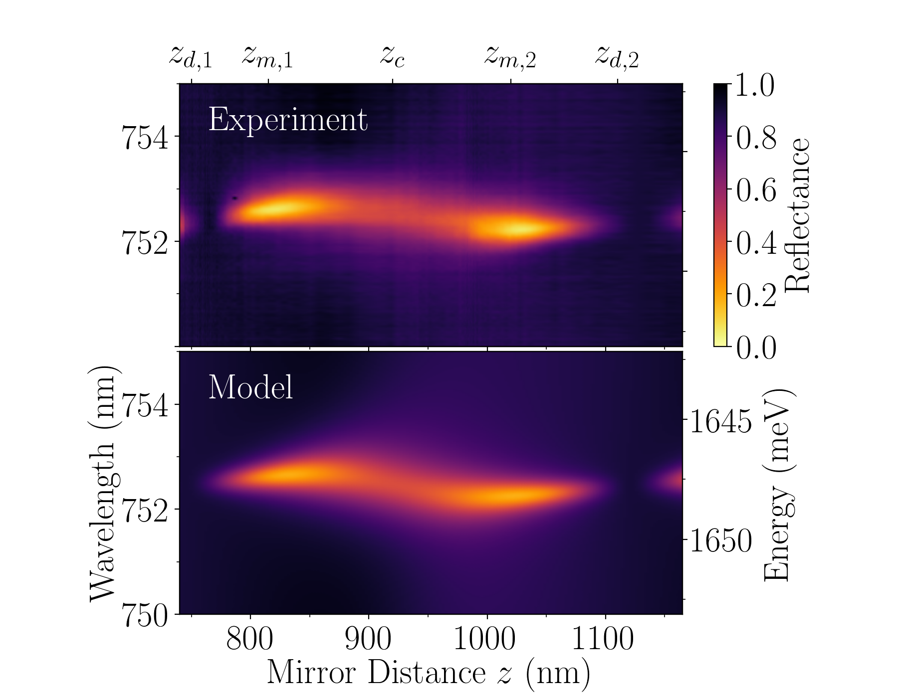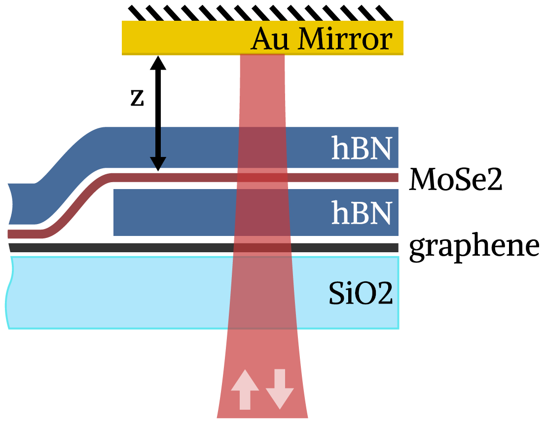The high quality and radiatively broadened nature of our samples implies that this change in radiative coupling to the environment should be accompanied by a change in total linewdith of the exciton resonance. In addition, the transverse coherence of exciton emission in a single layer of MoSe2 removes fundamental physical limitations of previous experiments employing point-like dipoles. This enables full control over the exciton radiative coupling rate and total linewidth at cryogenic temperatures from near-zero to 1.8 meV and from 0.9 to 2.3 meV, respectively. A plot of the experimental and modelled reflectance vs. mirror position is shown below. More details can be found in arXiv:1902.05036 .