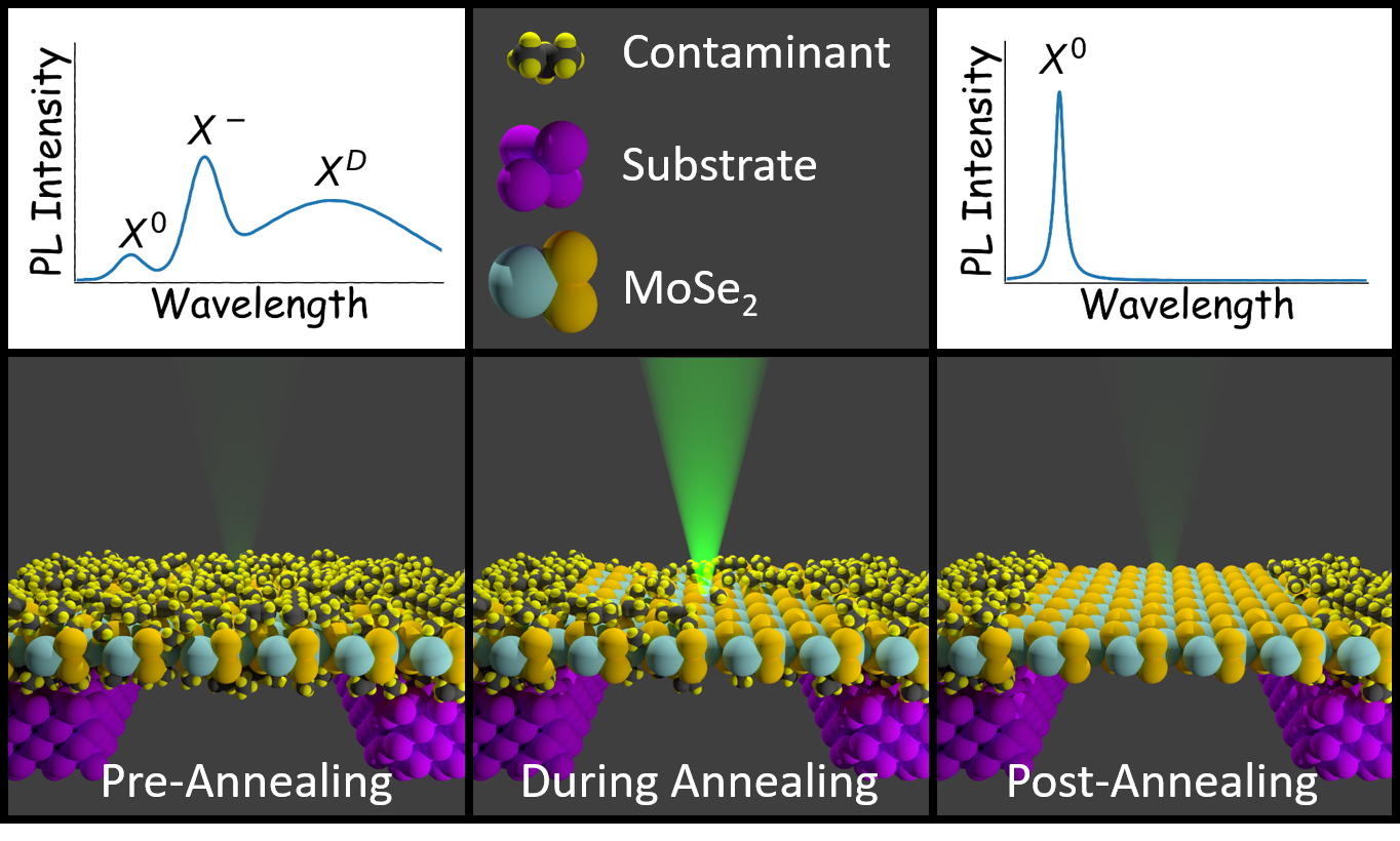A major challenge in making scalable devices from monolayer 2D materials is that large-transverse-area samples, which are typically grown using chemical vapor deposition (CVD), are of low optical quality. I have discovered and developed a laser annealing technique to drastically and repeatably increase the optical quality of suspended CVD-grown monolayers, which is outlined schematically below. More details can be found in Phys. Rev. Materials 2, 094003 .
