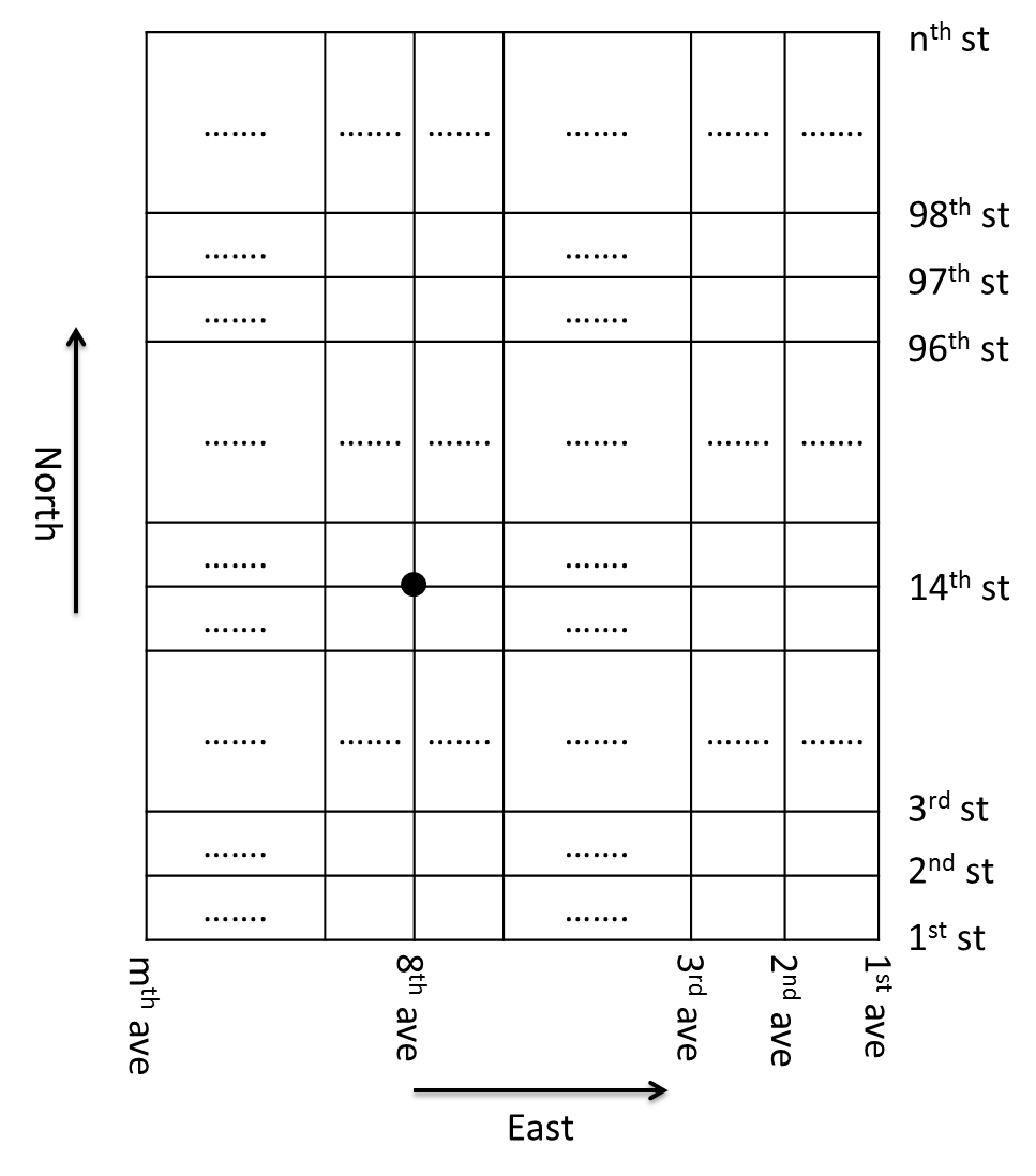 In Manhattan, the avenues run north-south and the streets run east-west. For simplicity, each point can be thought of as a (street, avenue) pair, where streets are numbered 1 to $n$ and avenues are numbered from 1 to $m$. Suppose you want to get from 14th St. & 8th Ave. to anywhere north of 96th St. in the shortest time. For simplicity, assume all streets are two-way; going east-west from one avenue to an adjacent one takes 3 units of time and going north-south from one street to another takes 1 unit of time.
