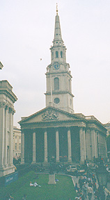 St. Martin-in-the-Fields located adjacent to Trafalgar Square. This picture was taken from the steps of the National Gallery (which is also, surprise, surprise, adjacent to Trafalgar Square). In addition to the normal religious functions, the church is the venue for many classical music concerts. We attended a Friday evening performance. All of the illumination during the performance was provided by candles set throughout the church. Very cool. There is a St. Martin-in-the-Fields web site which includes (among other things) some history and a listing of upcoming concerts. |