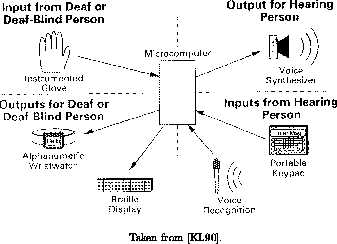 James Kramer and his supervisor, Larry Leifer, have been working on a method for communication between Deaf, Deaf-Blind and Non-vocal individuals. It is a complete system, which attempts to integrate a number of technologies together, in such a way that all parties can communicate. This is shown in thefigure below.