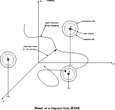 Of interest and relevance to us is the glove Kramer developed (the CyberGlove) and the technology used for recognizing American finger-spelling. At the moment, the system has acceptable finger-spelling performance, and James Kramer has set up a company, called Virtual Technologies, to market the system. In September 1995 VirTex released a commercial finger-spelling recognition package called GesturePlus. However, the system costs US$3500, and this price does not include the CyberGlove. Initially, he used a prototyping algorithm. There were prototypes for each letter, which Kramer termed ``beacons''. These beacons which are points in the hand state vector space, are then surrounded by hyperspheres. When a hand enters the the hypersphere, a letter is produced. This hypersphere, which Kramer calls a ``recognition ball'', lies within another hypersphere, which Kramer terms the ``hysteresis ball''. To repeat a sign, the hand must move outside the hysteresis ball, before another handshape is recognised (this intuitively makes sense, since when finger-spelling and a sign is to be repeated, it is typically made distinct in a similar manner -- ie the gesture is repeated twice). See figure below. This shows the hand-state moving through a vector space, which in this case is simplified to three dimensions, but there are 16 dimensions in the actual model.