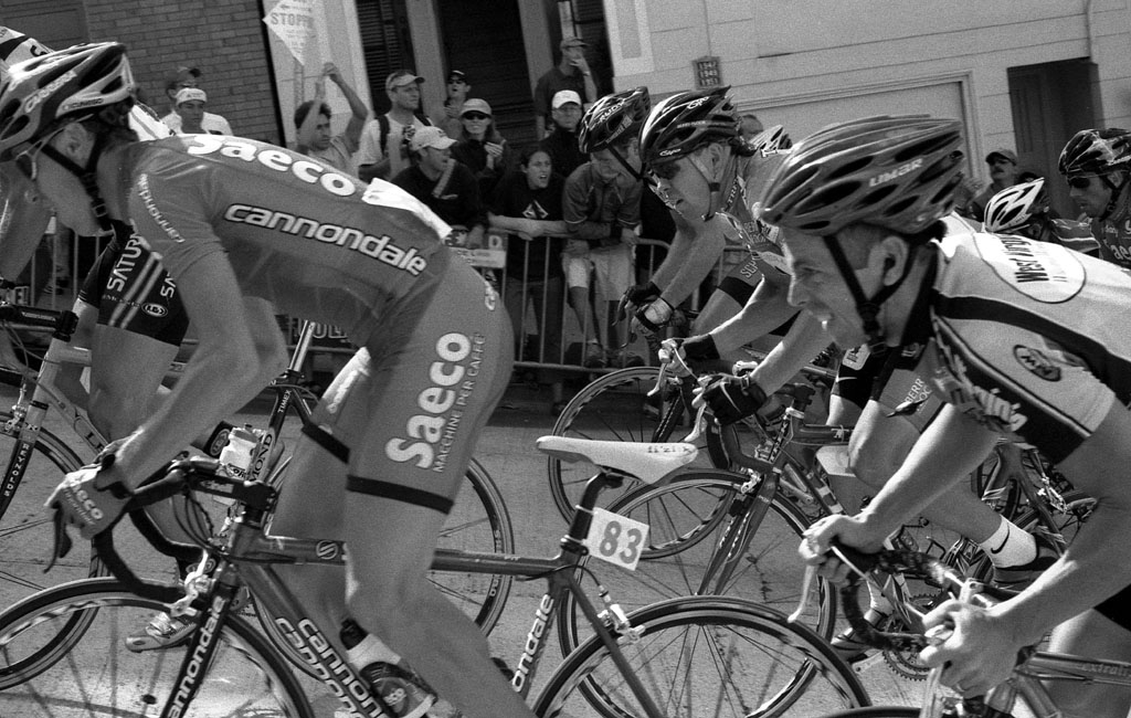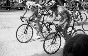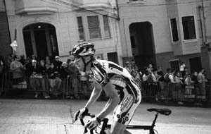 Your eventual winner, #3, Chris Horner, USA, Saturn, looking way too fresh. He flatted, caught the new breakaway and then pulled ahead all in one lap, so by the time he got to Taylor, he had a good lead. |