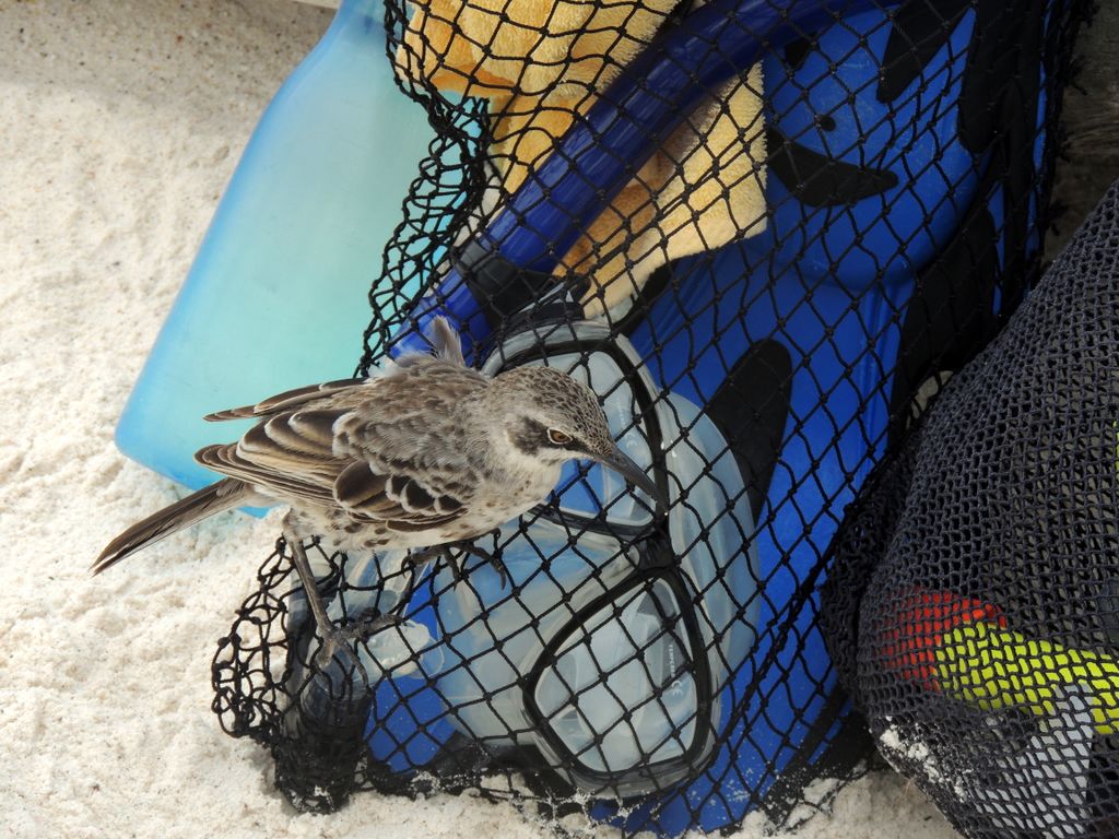 Galapagos2015 -- Espanola: Mockingbird hunting for water bottle