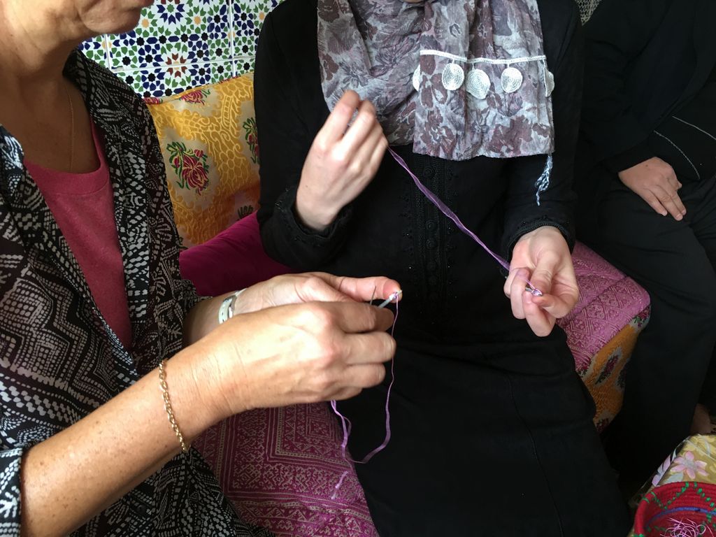 Morocco-2017 -- Sefrou: Deb learning how to make a jellaba button