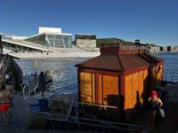 The roof of the museum gave great views of the waterfront including the Opera House next door. The Opera House has long ramps that allow you to climb from the harbour to its roof, and get further great views. One of which was the sauna boats docked - patrons can take a sauna and then jump into the fjord's chilly water.