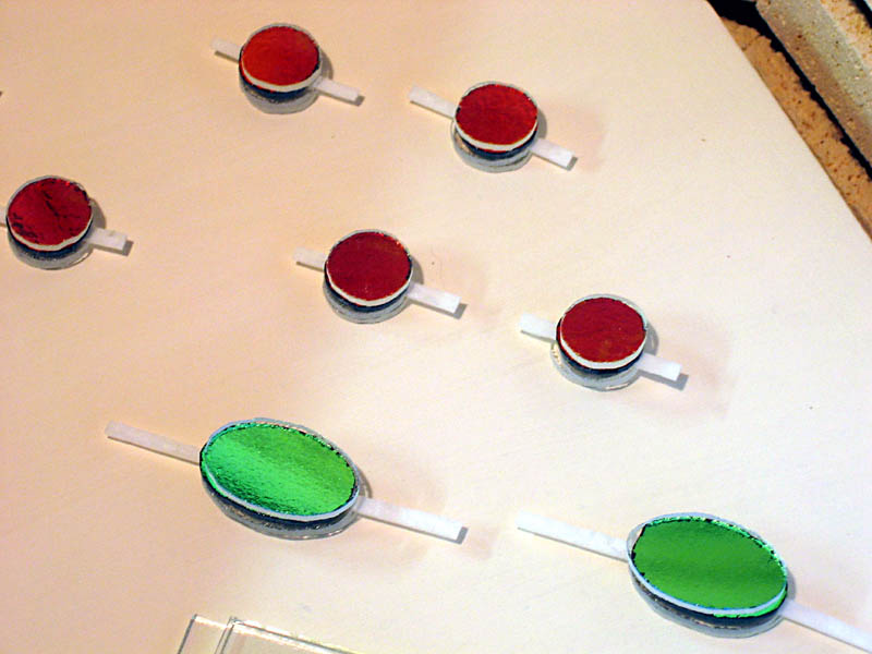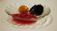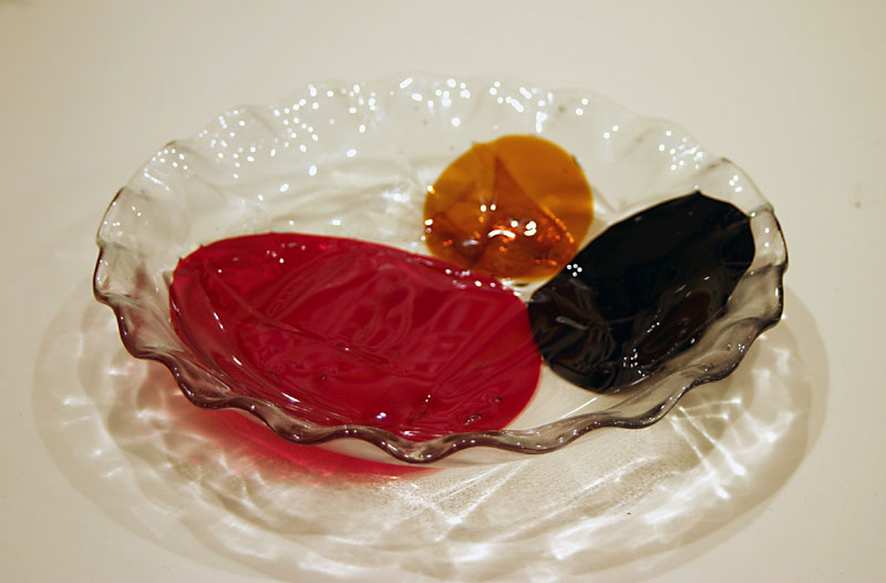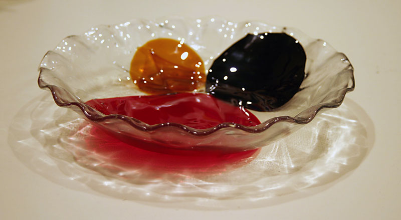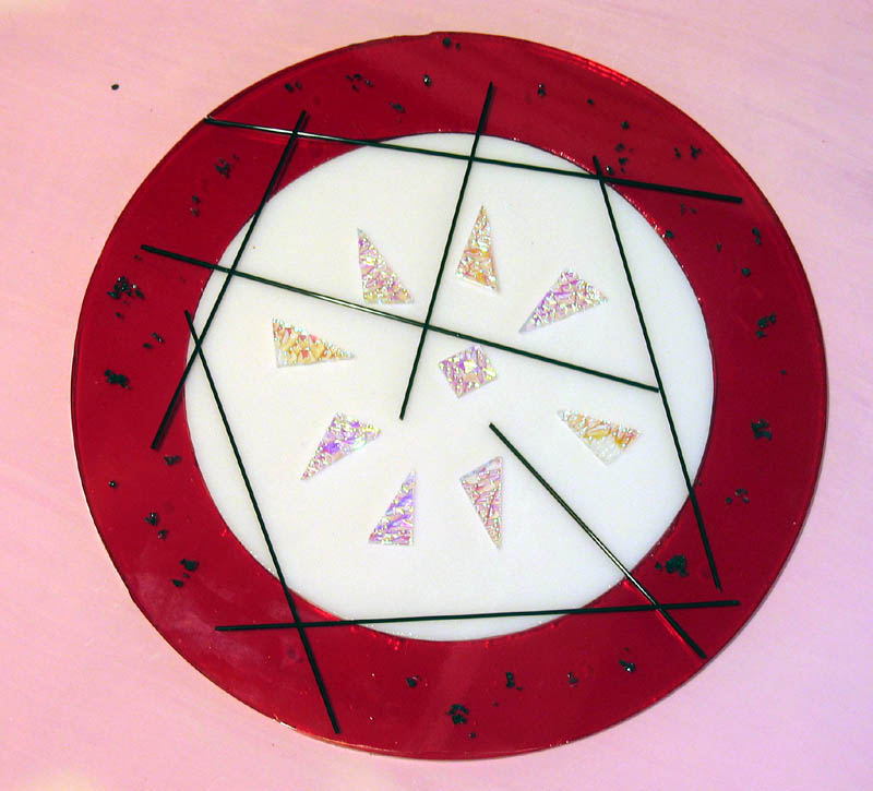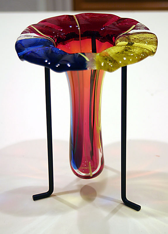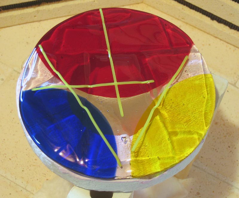 The fluted vase is two clear layers of S96 with circle segments in red, yellow and blue in between the clear. Then clear shards on top with a few yellow stringers.