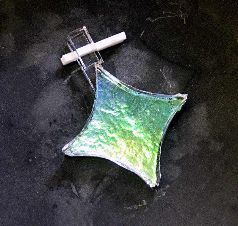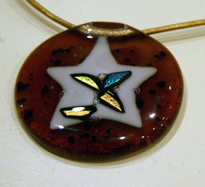 Star: S96 clear. amber, white with dichroic shards. 3 1/2 layers. Curved fiber paper between layers allows for stringing.