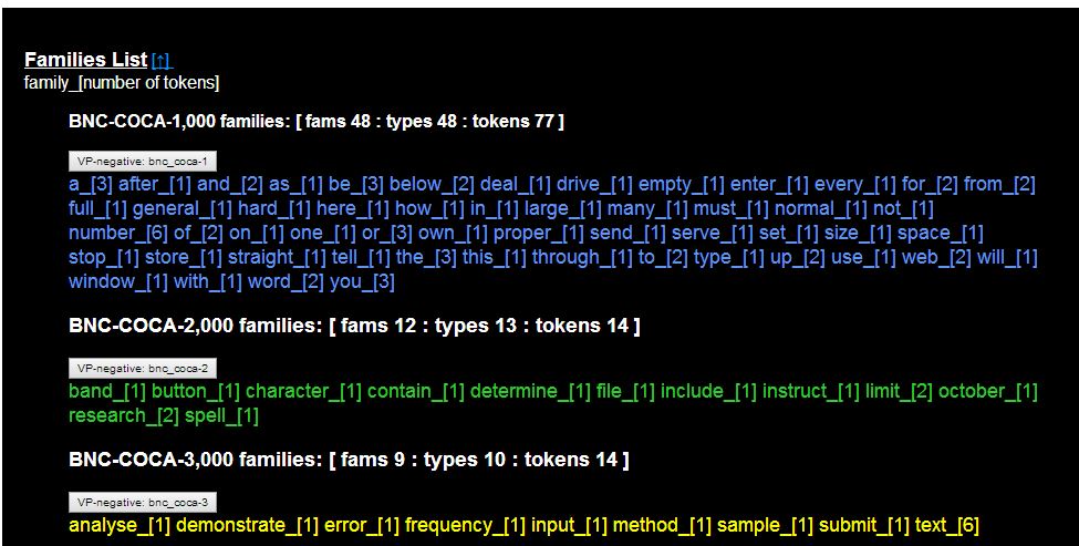 F. Load the transcript into the Lextutor vocabulary profiler, http://www.lextutor.ca/vp/comp, and click "submit". Go over the vocabulary profile and decide which words might be useful to learn. Note that the most useful information will be in the "Families List" at the end.