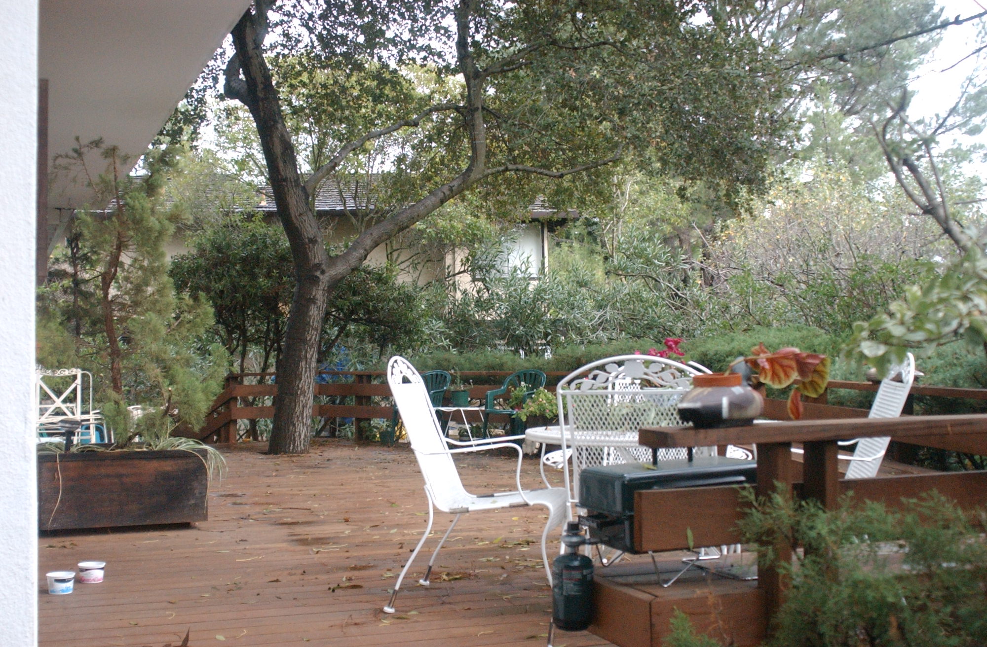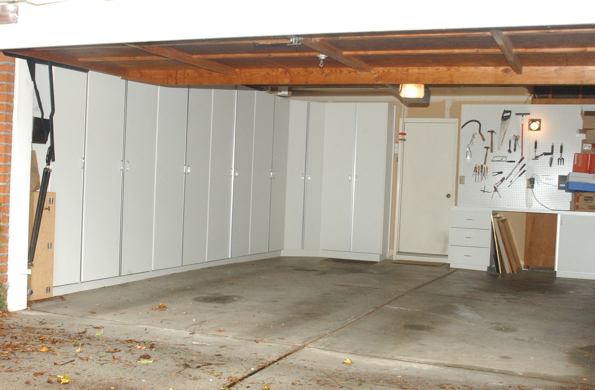 built in cabinets. The back wall has a work bench and space for a refrigerator
