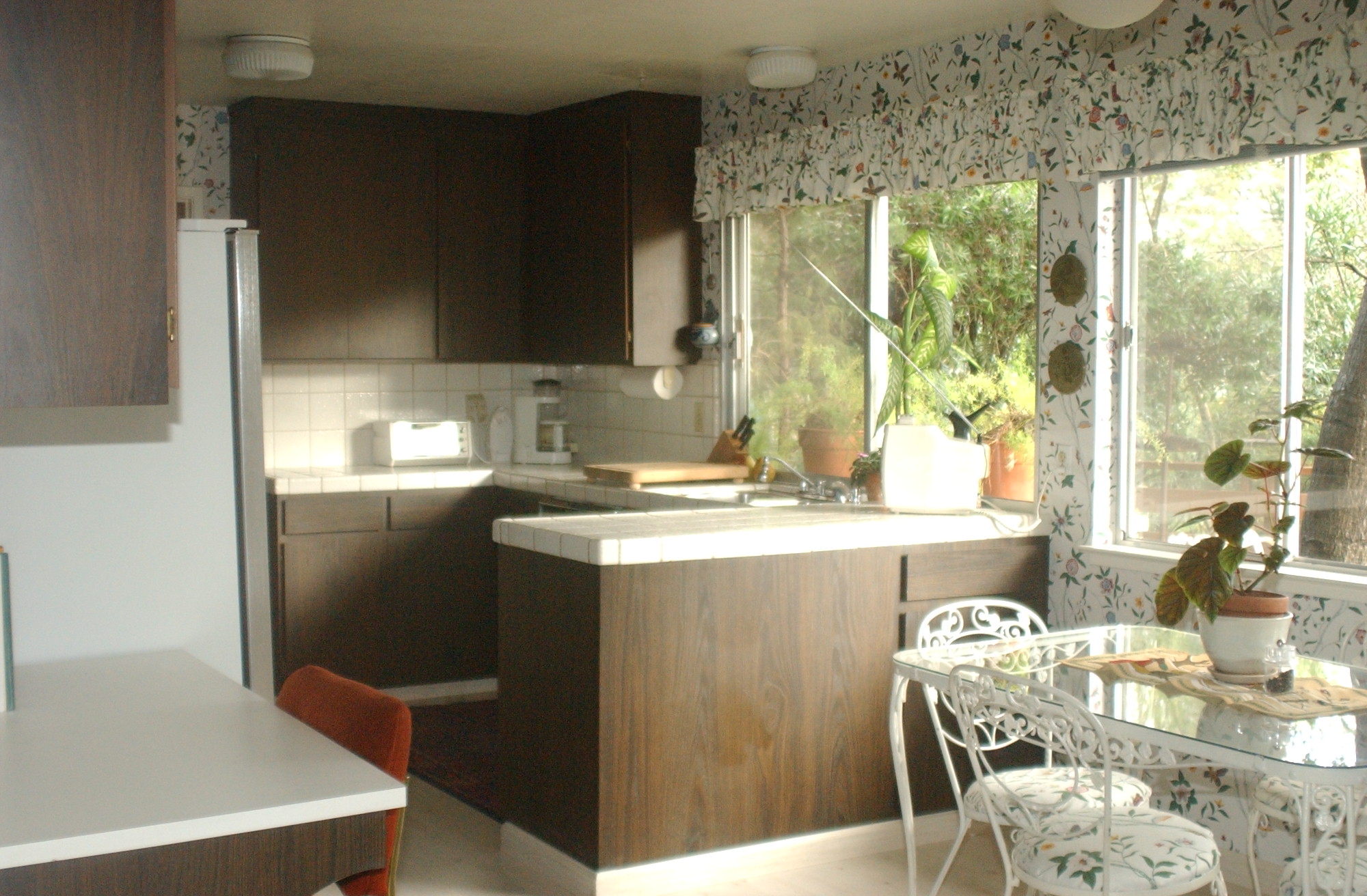 The sunny kitchen looks out on the deck and landscaped back yard. Pergo