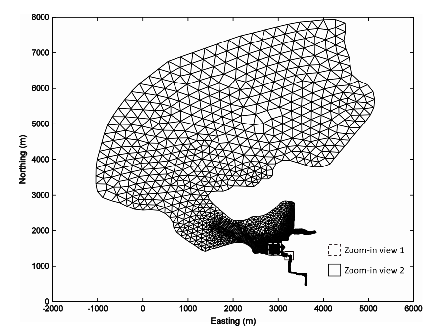 Figure 11: Unstructured grid of the Castro Cove region with zoomed-in views highlighting the use