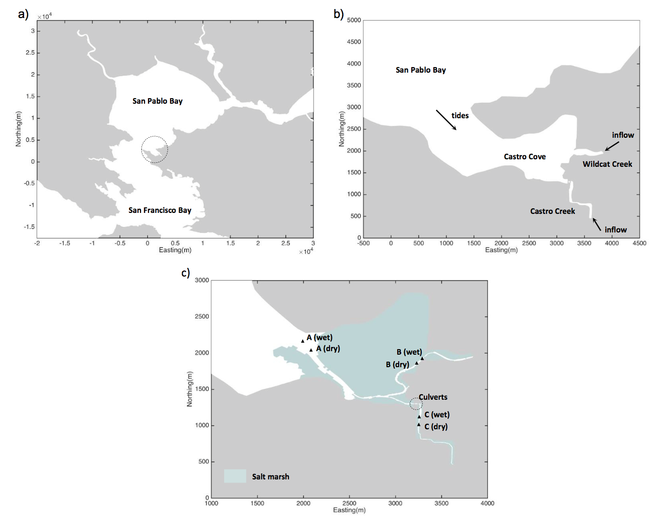 Figure 10: Map of the Castro Cove region (b) which is on the southern end of San Pablo Bay, CA (a), where