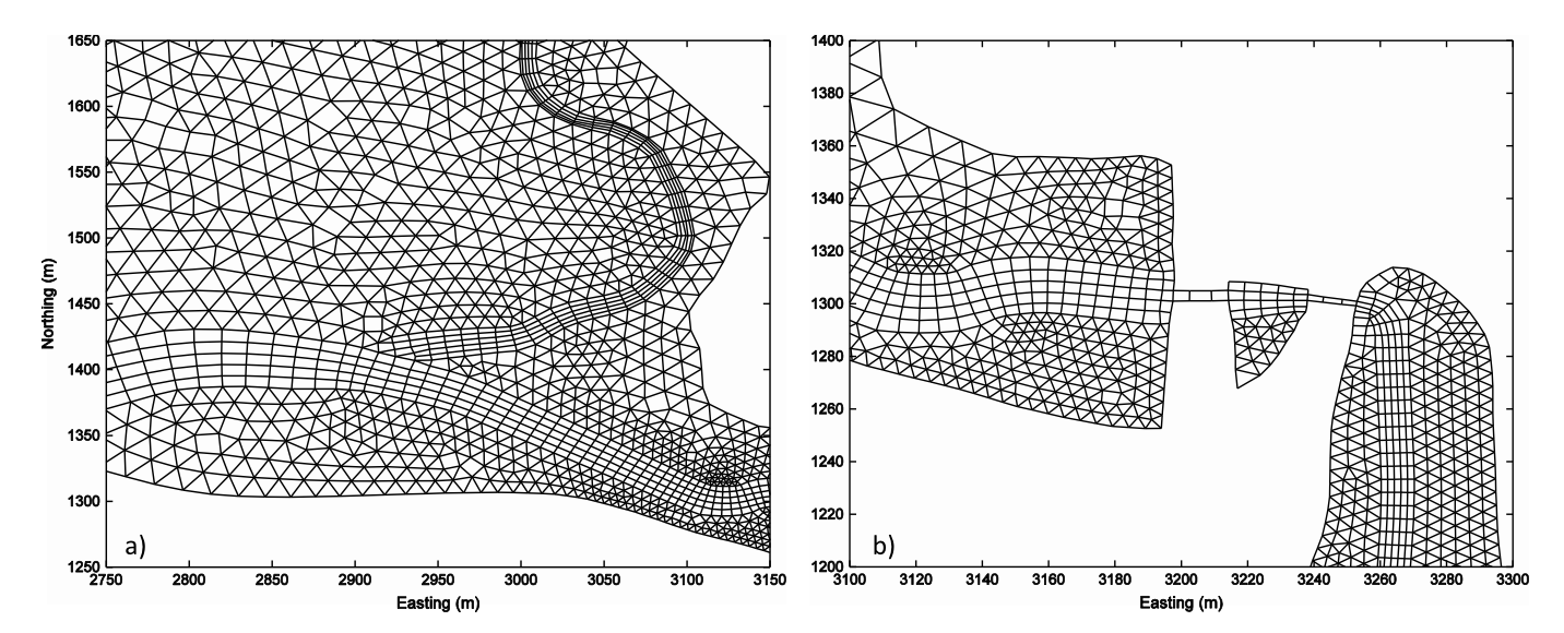 of quadrilaterals to resolve narrow channels. The narrow channels in (c) represent the culvert pipes.