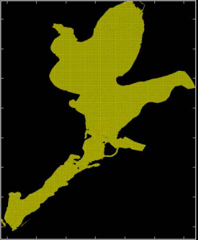 Each yellow dot corresponds to a particle that can be used to compute the residence time at that location in the Bay,