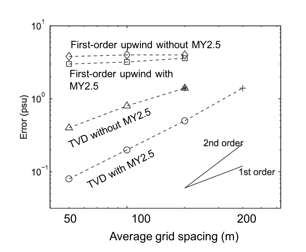 first-order upwinding) and the turbulence model (with and without the Mellor and Yamada