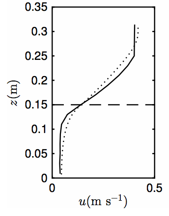 Figure 13: Comparison of modeled (dotted) to measured (solid) velocity profiles at location A