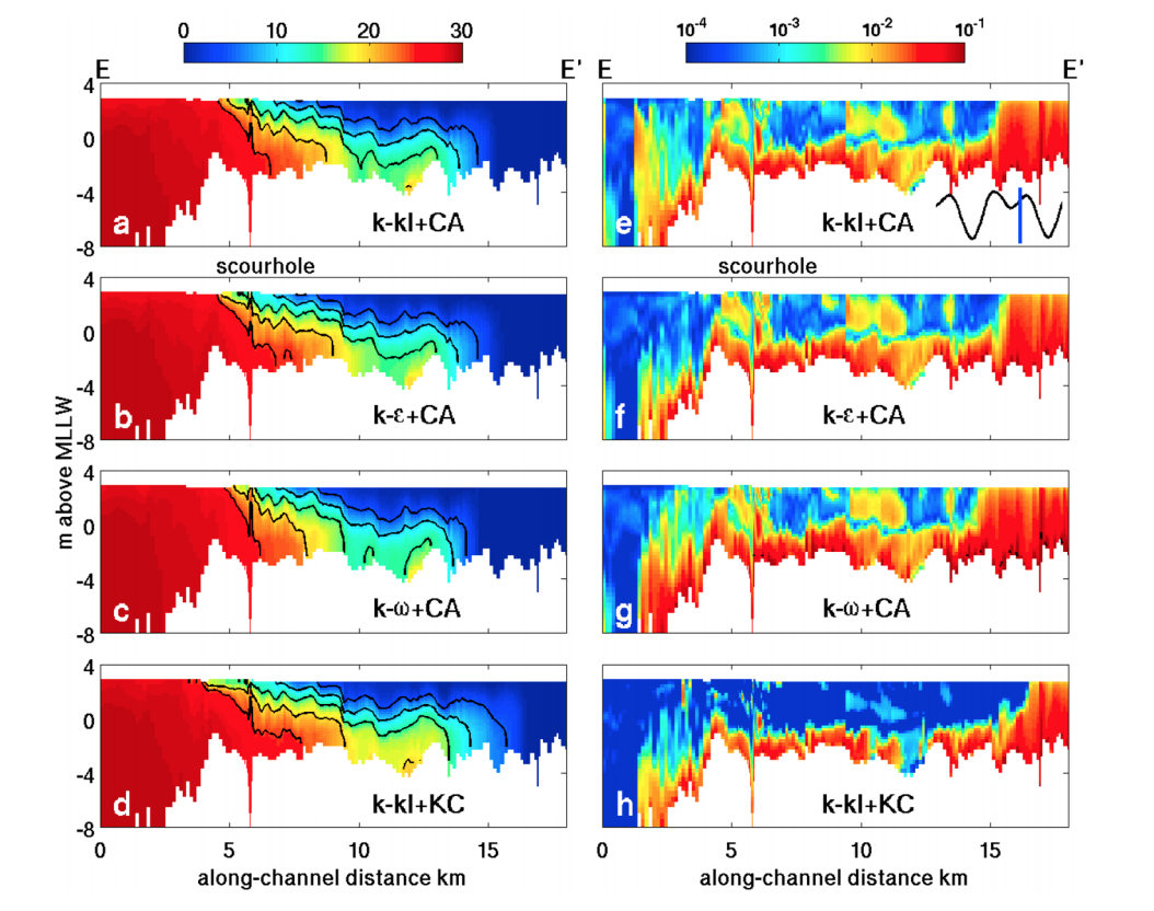 intrusion of the salt wedge with the KC stability function (Compare Figure 9 a and e to Figure 9 d and h), leading to a more