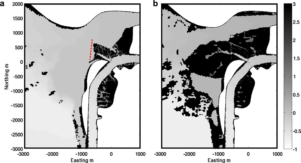 during low water with the original bathymetry, which was coarse to the west of the red dashed line.