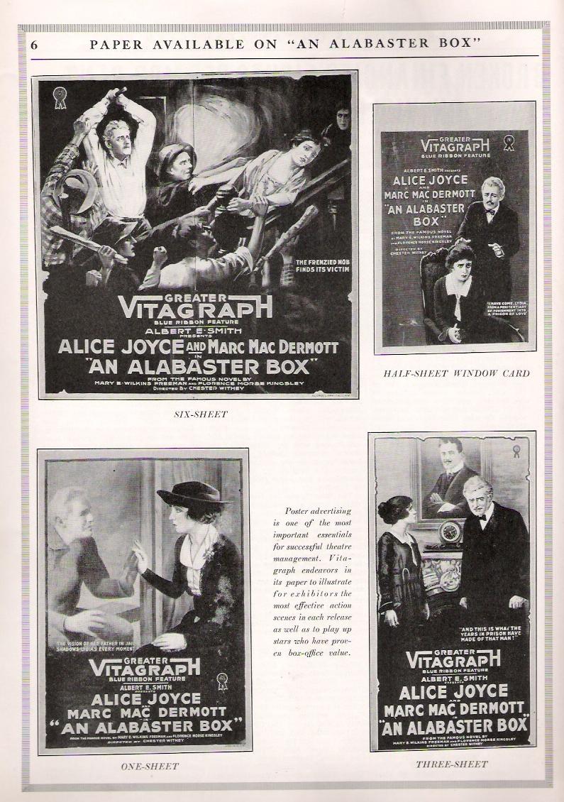 An Alabaster Box (1917) Vitagraph Co. of America. A Blue Ribbon Feature. Distributor: Greater Vitagraph (V.L.S.E., Inc). Director: Chester Withey. Scenario: A. Van Buren Powell Cast: Alice Joyce, Marc MacDermott, Harry Ham, Aida Horton, Patsey De Forest, Frank Crane. 5 reels. This film appears to be LOST