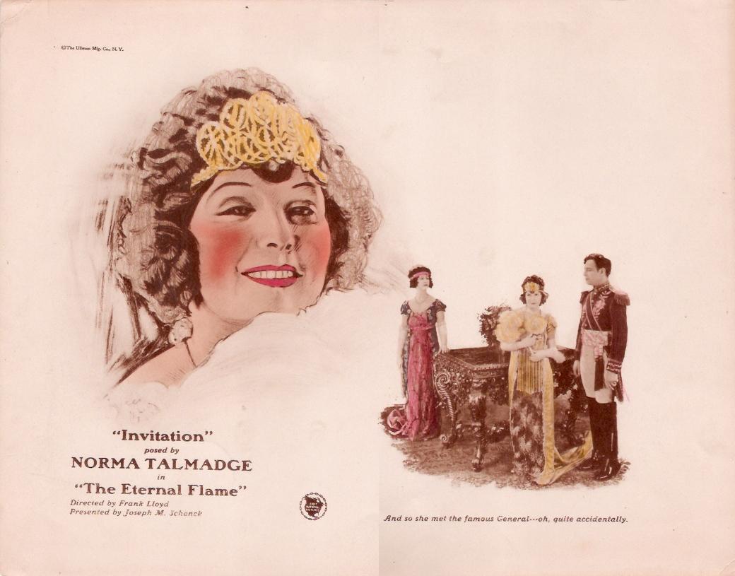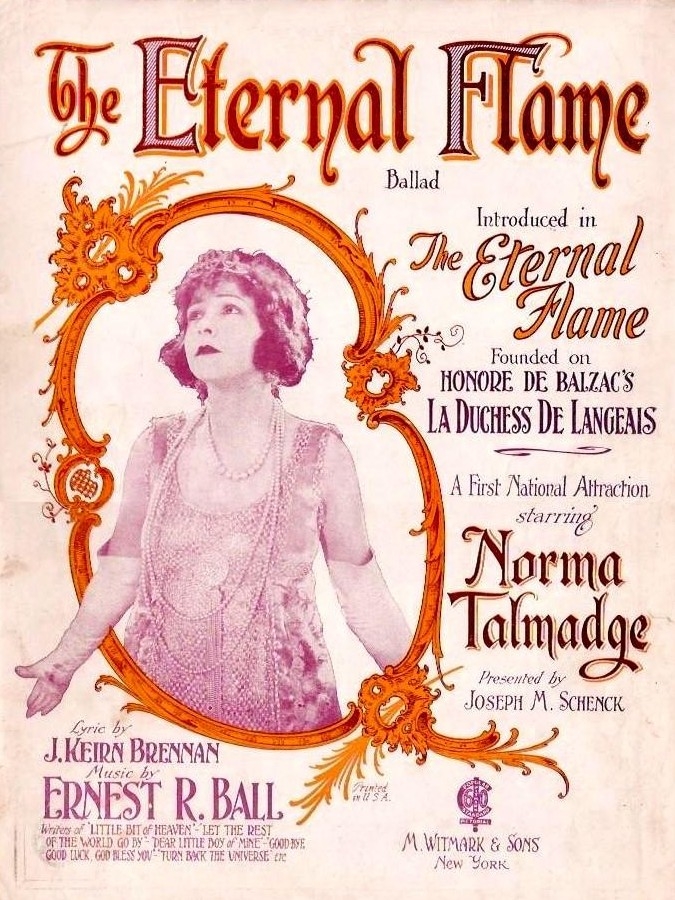The Eternal Flame (1922) Norma Talmadge Film Company/First National. Produced by Joseph M. Schenck. Directed by Frank Lloyd. Adapted by Frances Marion. Photography by Tony Gaudio. Art direction by Stephen Goosson. Costumes by Walter J. Israel. Cast: Norma Talmadge, Adolphe Menjou, Wedgewood Nowell, Conway Tearle, Rosemary Theby, Kate Lester, Thomas Ricketts, Otis Harlan, Irving Cummings. 8 reels. The Library of Congress has a copy of reels 1-2, and 4-7 (35 mm.)
