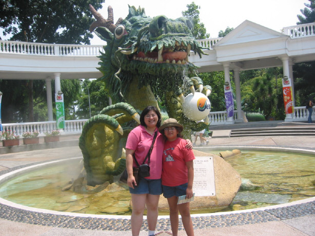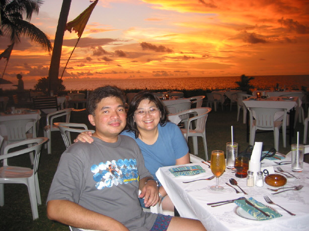 August 2002 - Our venue this time was Southeast Asia... We went to Singapore first and stayed three days at the Shangri-La Hotel. The service was superb... from the tray of troplical fruits to the platter of gourmet chocolates we had in our room, we felt like royalty. We went to Sentosa Island and took a city tour where we stopped by Little India and the National Orchid Garden. Flowers galore! From Singapore, we headed for Penang, Malaysia (Bob's turf) and stayed at the Shangri-La Rasa Sayang Resort for another three days. Truly a wonderful paradise. Penang is an island approximately 4 hours away from Kuala Lumpur, the nation's capital. Isabelle had fun swimming in the ocean. We had an outdoor Mongolian Barbecue buffet dinner at the hotel during our last evening in Penang. Look at that magnificent sunset!
