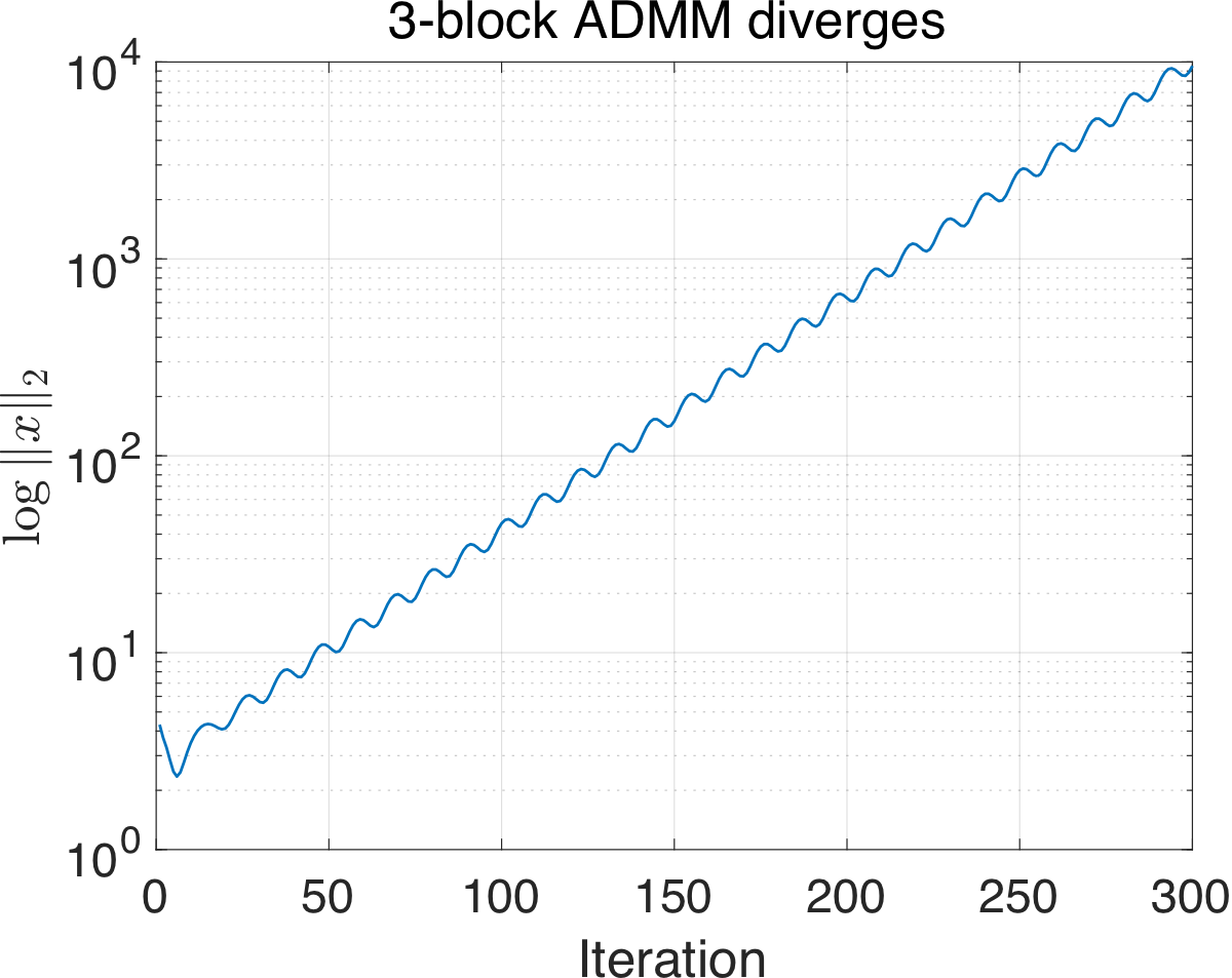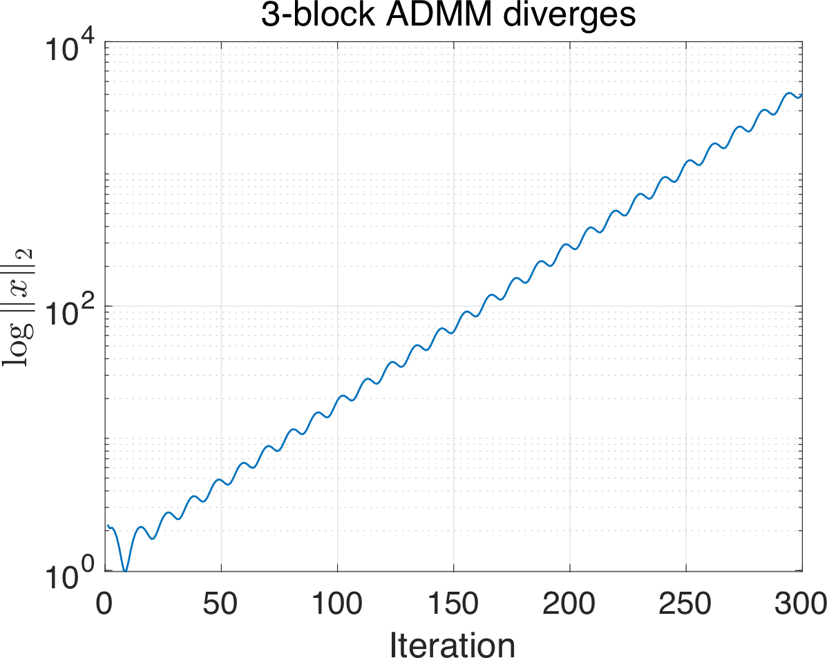 Consider the constrained optimization problem \[ \min_{\{x_i\}} \quad \sum_{i=1}^m f_i(x_i) \qquad \text{subject to} \quad \sum_{i=1}^m A_i x_i = b \quad (\lambda). \] One way of solving the problem is through alternating direction methods of multipliers (ADMM). Standard two-block (\(m = 2\)) version of ADMM is effective in both theory and in practice: \[ \begin{aligned} x_1^{k+1} &= \arg\min_{x_1} \left\{ f_1(x_1) + f_2(x_2^k) + \langle \lambda^k, A_1 x_1 + A_2 x_2^k - b \rangle + \tfrac{\rho}{2}\|A_1 x_1 + A_2 x_2^k - b\|^2 \right\} \\ x_2^{k+1} &= \arg\min_{x_2} \left\{ f_1(x_1^{k+1}) + f_2(x_2) + \langle \lambda^k, A_1 x_1^{k+1} + A_2 x_2 - b \rangle + \tfrac{\rho}{2}\|A_1 x_1^{k+1} + A_2 x_2 - b\|^2 \right\} \\ \lambda^{k+1} &= \lambda^k + \rho (A_1 x_1^{k+1} + A_2 x_2^{k+1} - b). \end{aligned} \] However, when the block number \(m \geq 3\), it is known that the direct extension of two-block ADMM to multi-block even cannot converge for a simple linear feasibility problem (Chen et al. 2016): \[ \begin{aligned} \min_{x_1, x_2, x_3} \quad & 0 \\ \text{subject to} \quad & \begin{pmatrix} 1 \\ 1 \\ 1 \end{pmatrix} x_1 + \begin{pmatrix} 1 \\ 1 \\ 2 \end{pmatrix} x_2 + \begin{pmatrix} 1 \\ 2 \\ 2 \end{pmatrix} x_3 = 0. \end{aligned} \tag{2}\label{eq-counterexample} \]
