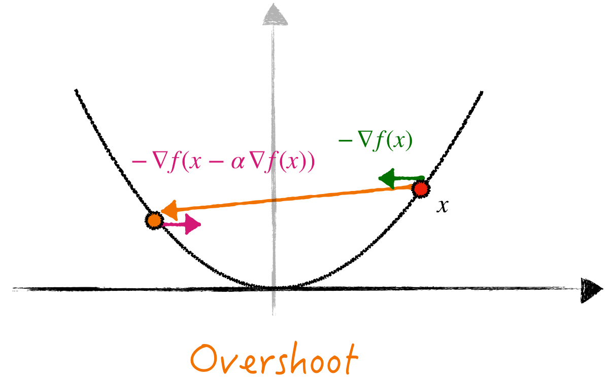 - If we use stepsize \(\alpha > 1\), then a gradient descent step “overshoots” the solution and zig-zags between two branches of the graph (Figure 1, left), hence the (negative) gradient direction between two consecutive iterates will have different signs: \(\langle \nabla f(x - \alpha \nabla f(x)), \nabla f(x) \rangle < 0\). Step \((1)\) (with small \(\eta > 0\)) encourages \(\alpha_{k+1}\) to get closer to \(\alpha^\star\).