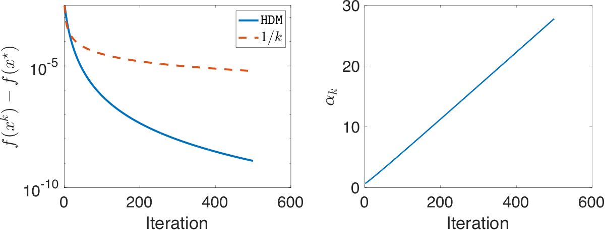 HDM on \(f(x) = \tfrac{1}{4}x^4\). The stepsize \(\{\alpha_k\}\) keeps increasing and the convergence rate is faster than \(\mathcal{O}\!\left(\tfrac{1}{K}\right)\) predicted by theory.Another interesting observation is the convergence rate (Figure 3, left). It seems HDM is converging faster than \(\mathcal{O}\!\left(\tfrac{1}{K}\right)\). Why does this happen? Recall the convergence rate of gradient on \(L\)-smooth functions \[