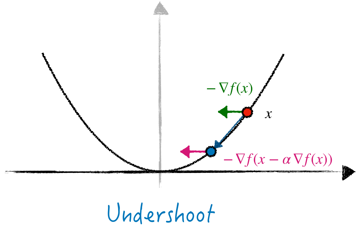 - Similarly, if \(\alpha < 1\), the iterate will stay on one branch of the graph (Figure 1, right), making \(\langle \nabla f(x - \alpha \nabla f(x)), \nabla f(x) \rangle > 0\). Again, step \((1)\) encourages \(\alpha_{k+1}\) to get closer to \(\alpha^\star\).