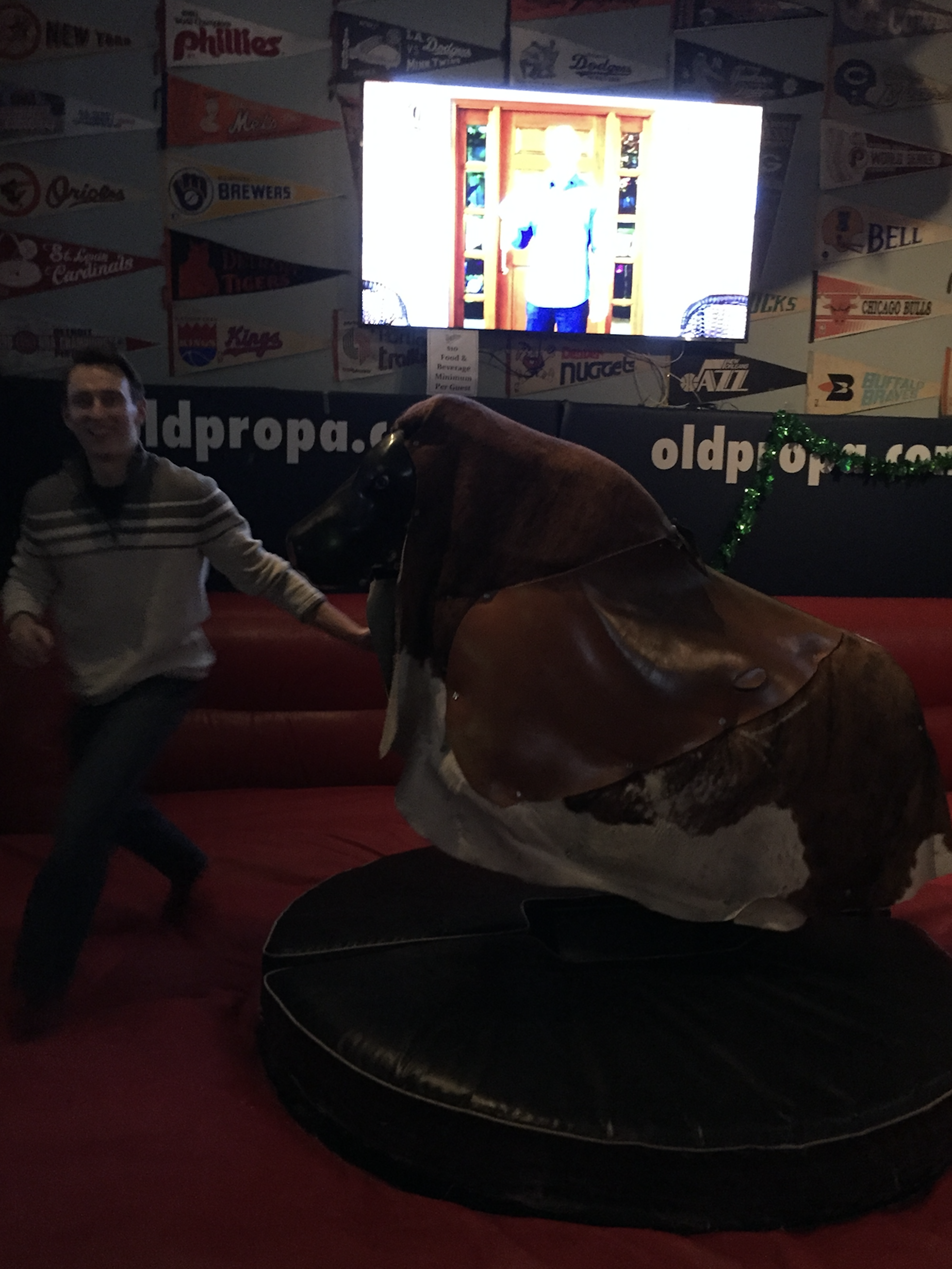 Mr. Michaels finishing riding a mechanical bull. Can he still walk in straight line?