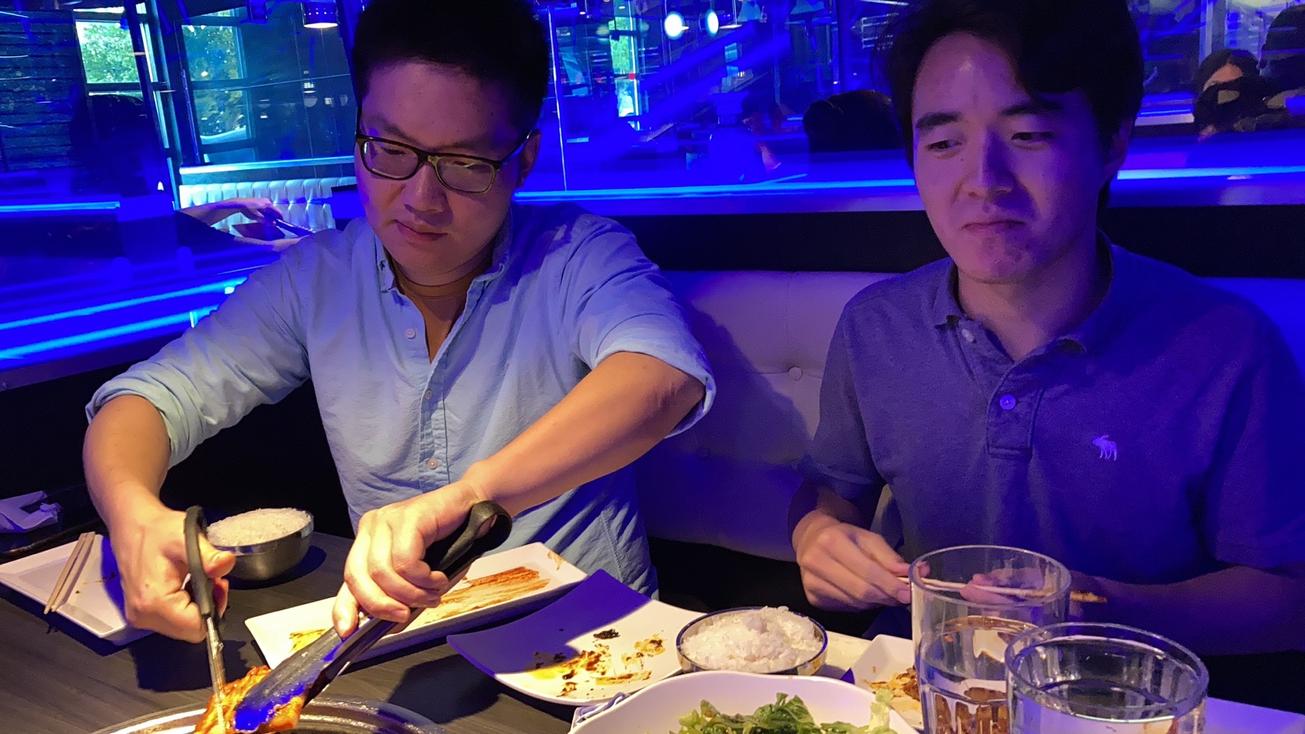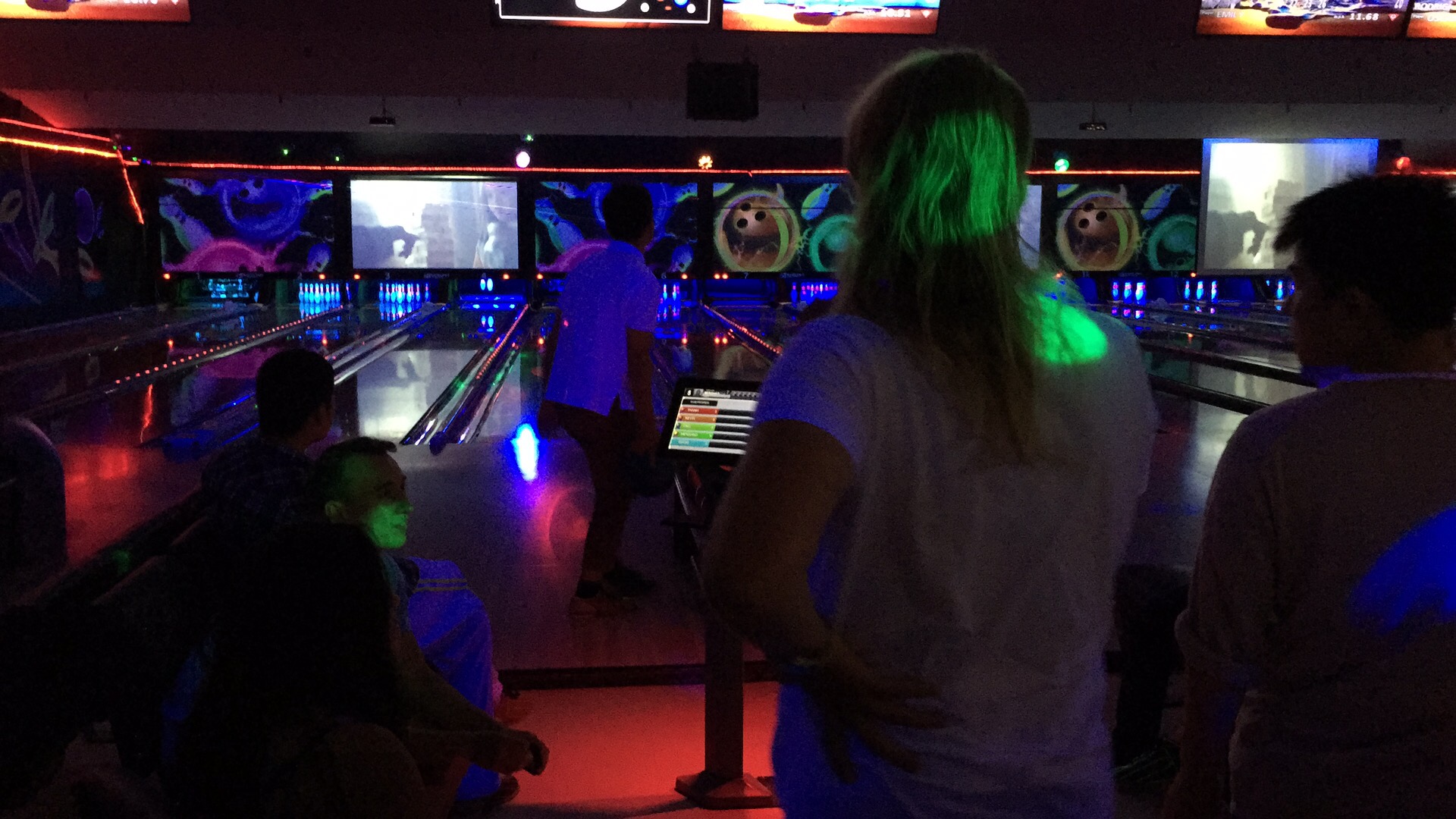 Group bowling night. Kyle, Thanh and Gruoxi are watching Menghao bowling while Wes appears to be chatting with Huada trying to find out where Sean and Kevin have been.