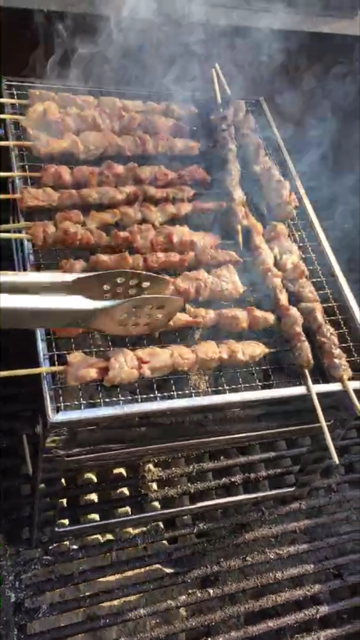 Group gathering in Jian's home, featuring Shish Kebab.