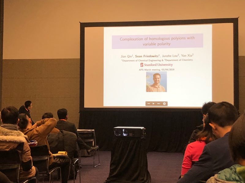 Sean, Kevin, Huada, Guoxi, and Jian attended the APS march meeting in LA. Sean spoke about his work on charge association effects in polyelectrolyte solutions. Kevin spoke about his work on the competition of ion solvation with entropy. Huada presented a poster on his work on modeling of ladder polymers. Guoxi presented a poster on his work on all-atom simulation of concatenated polyethylene rings.