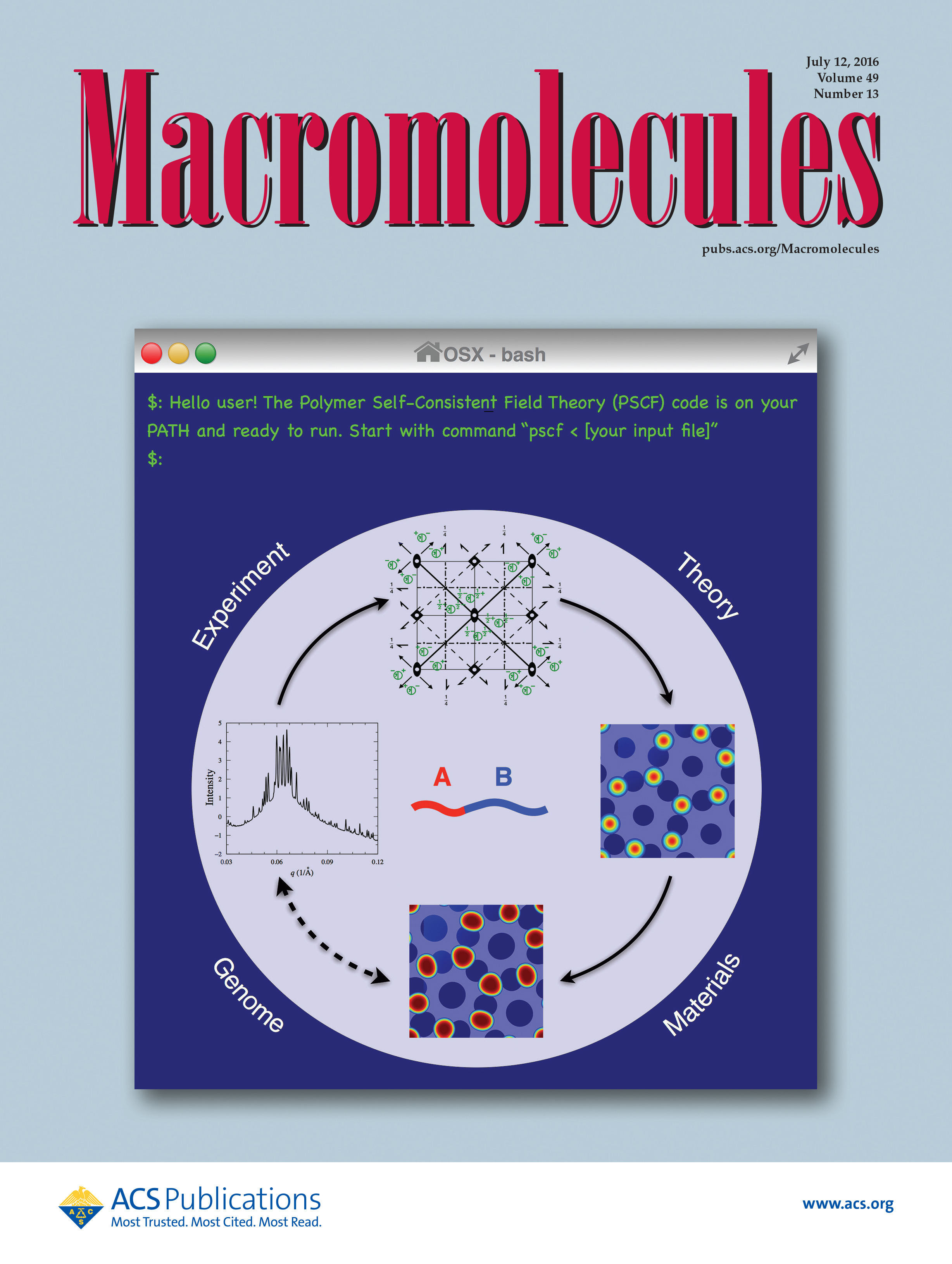 Cover image from Macromolecules highlighting our work. "$. Hello User! The Polymer Self-Consistent Field Theory (PSCF) code is on your PATH and ready to run."