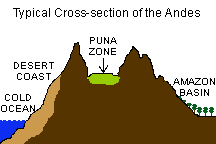 The Puna zone lies between the cold desert western slopes of the andes, and the warmer, wetter, eastern slopes that fall down into the amazon basin. Because of this position, the cold air over the ocean picks up a lot of moisture and carries it up over the western peaks, until it meets warmer air from the east that can not hold this moisture. This is what brings the rain to the puna zone where these air currents meet. The amazon basin gets a huge amount of rain, both from the atlantic, and left over moisture that was not released onto the puna.